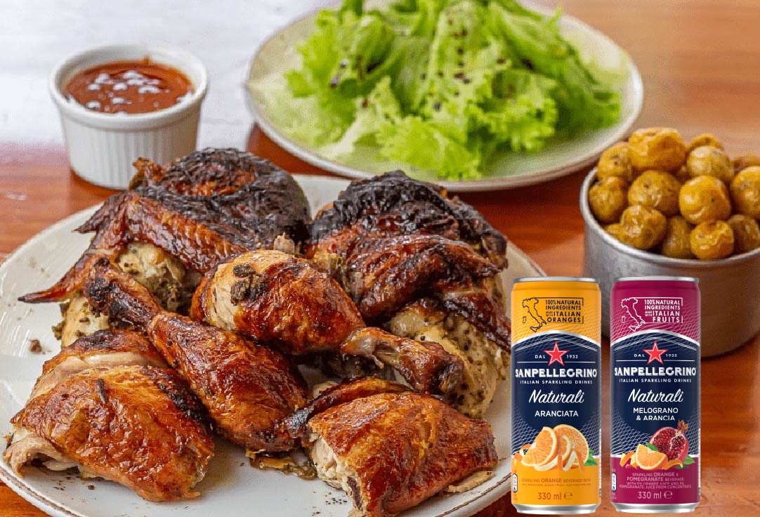 descuento en combo de pollo rotisserie completo con 2 bebidas sanpellegrino • sólo hasta las 3 pm, sujeto a disponibilidad.